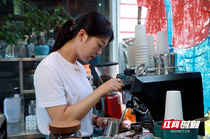 豬欄咖啡主理人蔣玉萍做咖啡。蔣璇 攝