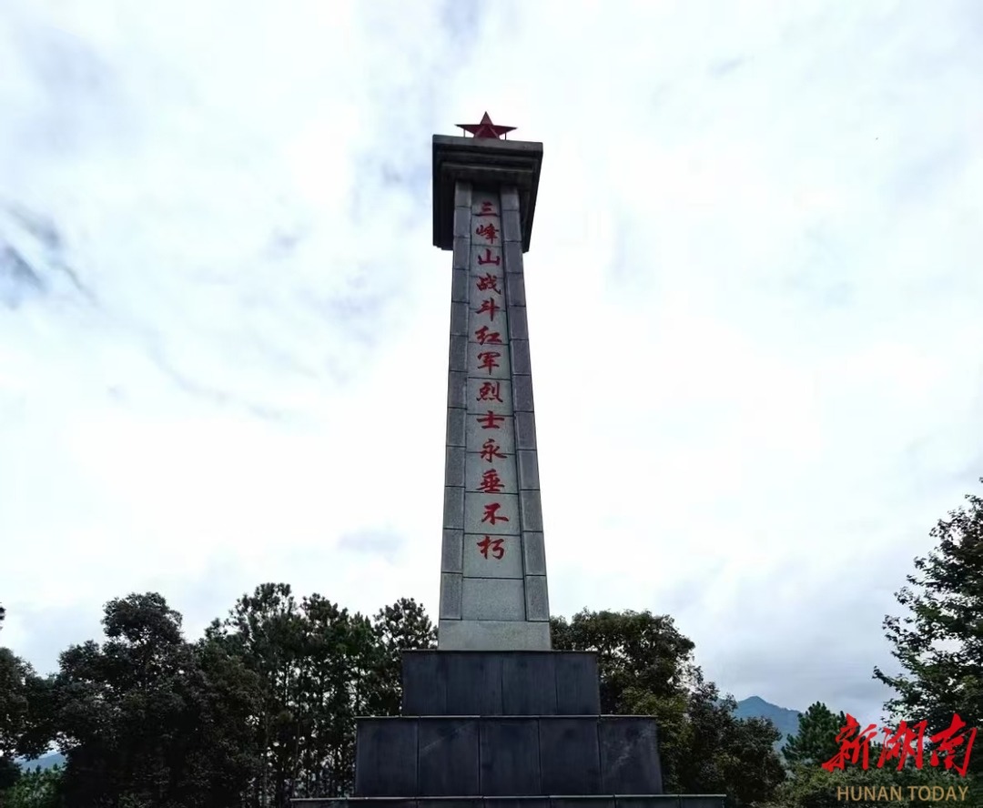 三峰山海拔1528米,山高路陡林密,山中的一條羊腸小道通關(guān)廣西壯族自治區(qū)灌陽縣,軍事上具有重要意義。80多年前,紅八、紅九軍團為突破敵人的封鎖,曾在三峰山與桂系軍閥激戰(zhàn)3個多小時,留下了光輝的戰(zhàn)斗印跡。三峰山戰(zhàn)斗紅軍紀念碑肅立在山頂,上書“三峰山戰(zhàn)斗紅軍烈士永垂不朽”。紀念碑高高聳立,莊嚴肅穆,周圍松柏環(huán)繞,不時有過往行人前來祭奠。