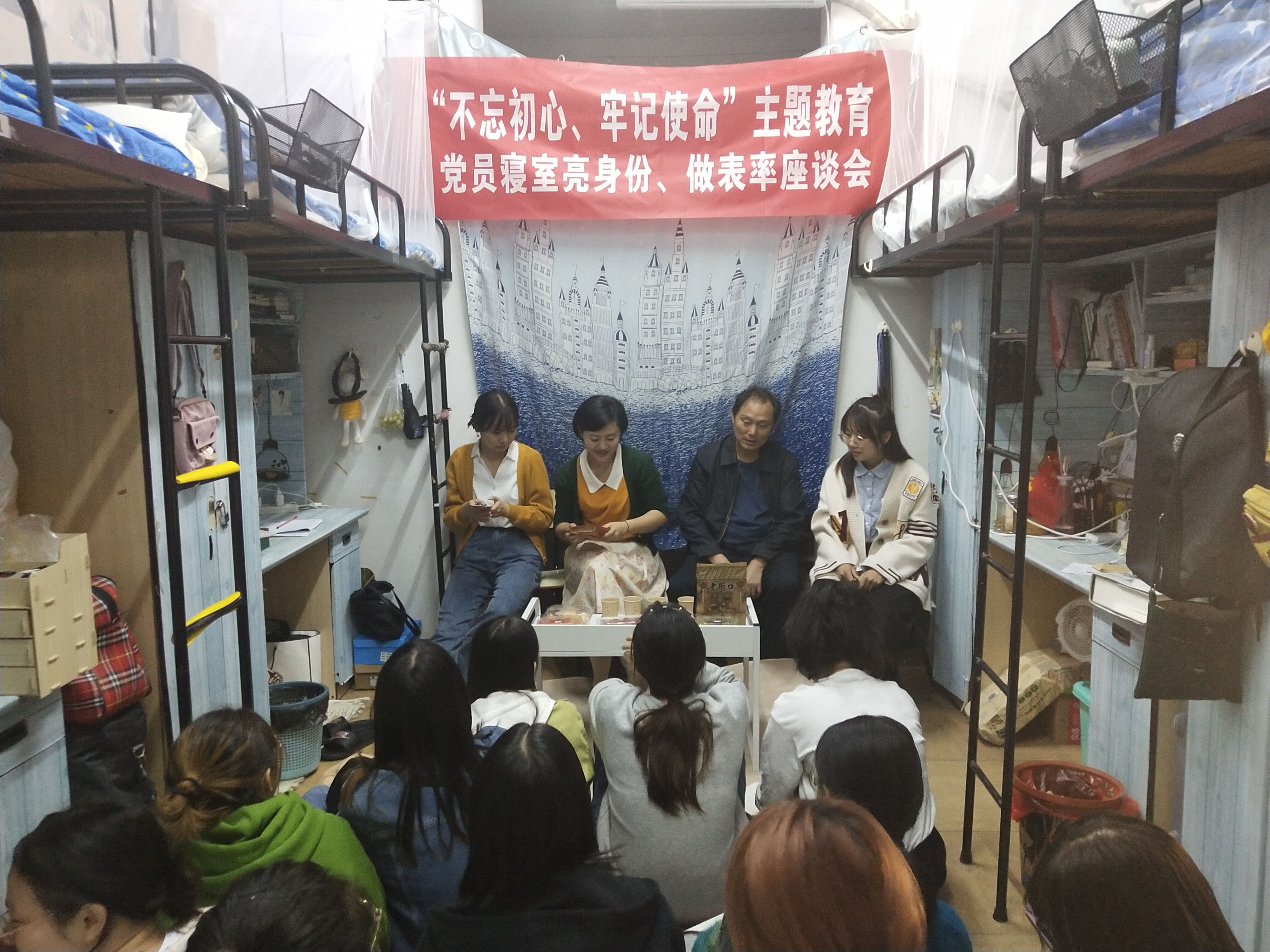 首先,對黨員寢室逐一走訪,了解寢室文明衛(wèi)生、寢室公約等落實(shí)情況。隨后,全體學(xué)生黨員集中在5棟603黨員寢室召開“不忘初心 牢記使命”主題教育——黨員寢室亮身份、做表率座談會。