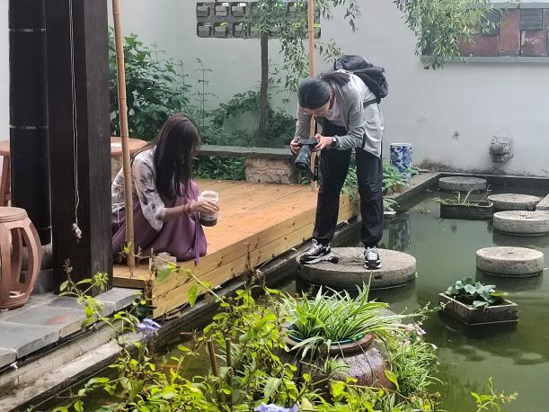 四合小院,黛瓦白墻,空氣中混合著草木清香,身處其中,仿佛消散了長沙夏日的悶熱。推開木門,沿著石板小路,我們來到正堂,民宿主人熱情地招待了我們,我們支起攝像機,在艾草熏香的屋內(nèi)談起了關(guān)于這個民宿的故事。
