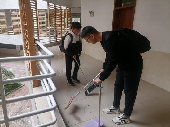 同學(xué)們以對勞動的熱情和對學(xué)校的熱愛,認(rèn)真參加義務(wù)勞動。十五棟教學(xué)樓里到處是他們來來往往忙碌的腳步,陽光大草坪上是他們低頭彎腰除草的剪影,包括食堂周圍都是一片整潔。