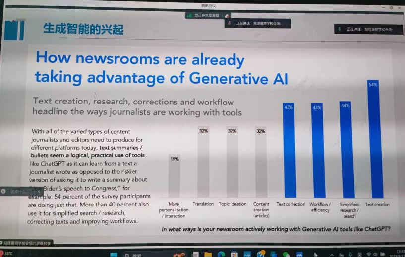 周葆華教授指出智能與算法無法割裂,人工智能的典型代表是算法,推薦算法由分發(fā)、匹配到生產(chǎn)就是算法到智能:生成智能的興起。生成智能不斷擴散,推薦算法正在重塑媒體與社會。他以機器人寫作、Chat GPT等人工智能為例,提出生成智能擁有其獨特的優(yōu)勢,能幫助人們減輕壓力,但是人工智能不能取代人類創(chuàng)造性活動。作為記者,在進行采寫與創(chuàng)作時,我們可以利用相關(guān)軟件與工具協(xié)助創(chuàng)作,可以有針對性地學(xué)習(xí)計算傳播的新知識。