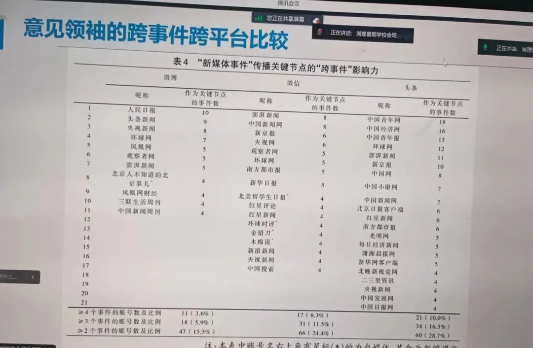 周葆華教授表示,計算與智能傳播研究主要有五個方面的價值。其一是做大規(guī)模的多案例的比較,注重對于基礎(chǔ)理論和傳播學(xué)規(guī)律的分析,并以自身研究“意見領(lǐng)袖的跨事件跨平臺比較”為例,指出多案例分析有助于社會規(guī)律的發(fā)現(xiàn)。
