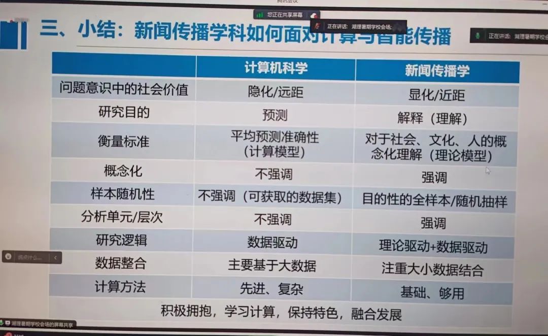 周葆華教授通過比較計算機科學(xué)與新聞傳播學(xué)的問題與社會價值、研究目的、衡量標(biāo)準(zhǔn)、概念化、樣本隨機性、分析單元/層次、研究邏輯、數(shù)據(jù)整合、計算方法等,建議同學(xué)們積極擁抱新事物,學(xué)習(xí)基本計算能力,保持我們的專業(yè)特色以及優(yōu)勢并且融合發(fā)展。