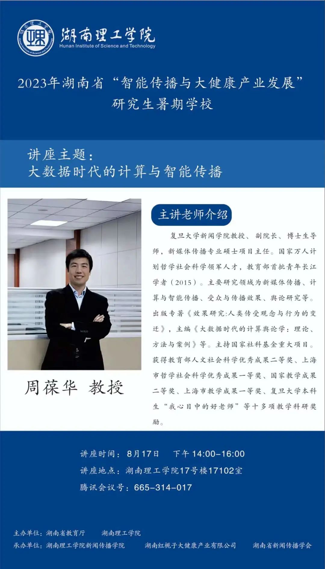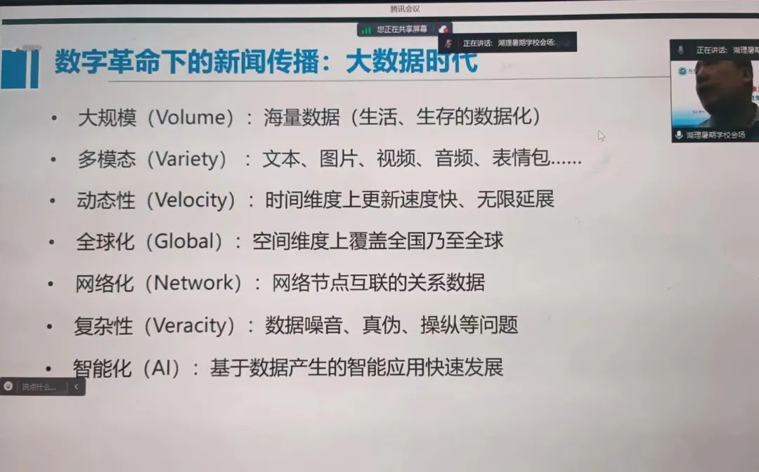 【編者按】8月16日至30日,由湖南省教育廳、湖南理工學(xué)院主辦,湖南理工學(xué)院新聞傳播學(xué)院、湖南紅梔子大健康產(chǎn)業(yè)有限公司、湖南省新聞傳播學(xué)會承辦的2023年湖南省“智能傳播與大健康產(chǎn)業(yè)發(fā)展”研究生暑期學(xué)校邀請國內(nèi)新聞傳播學(xué)科知名專家學(xué)者、健康傳播產(chǎn)業(yè)領(lǐng)域業(yè)界專家授課。來自湖南理工學(xué)院、中國傳媒大學(xué)等全國各大高校的119名博士研究生、碩士研究生、本科生入學(xué),開展專題研學(xué)。8月17日下午,復(fù)旦大學(xué)新聞學(xué)院教授、副院長、博士生導(dǎo)師、新媒體傳播專業(yè)碩士項目主任周葆華作了題為“大數(shù)據(jù)時代的計算與智能傳播”的講座。本場講座主持人為湖南理工學(xué)院新聞傳播學(xué)院副院長肖濤教授。本文根據(jù)講座內(nèi)容整理。