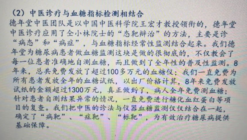 德年堂中醫(yī)團(tuán)隊是以中國中醫(yī)科學(xué)院王宏才教授領(lǐng)銜的,德年堂中醫(yī)診療應(yīng)用了仝小林院士的"態(tài)靶辯治"的方法,主要是診“病態(tài)”和“病癥”,與血糖指標(biāo)經(jīng)常性監(jiān)測結(jié)合起來。繆嘉軍研究員及其團(tuán)隊把中醫(yī)的診法與儀器血糖監(jiān)測結(jié)合在一起,確定了“病靶”、“癥靶”、“標(biāo)靶”,為有效治療糖尿病提供基礎(chǔ)保障。