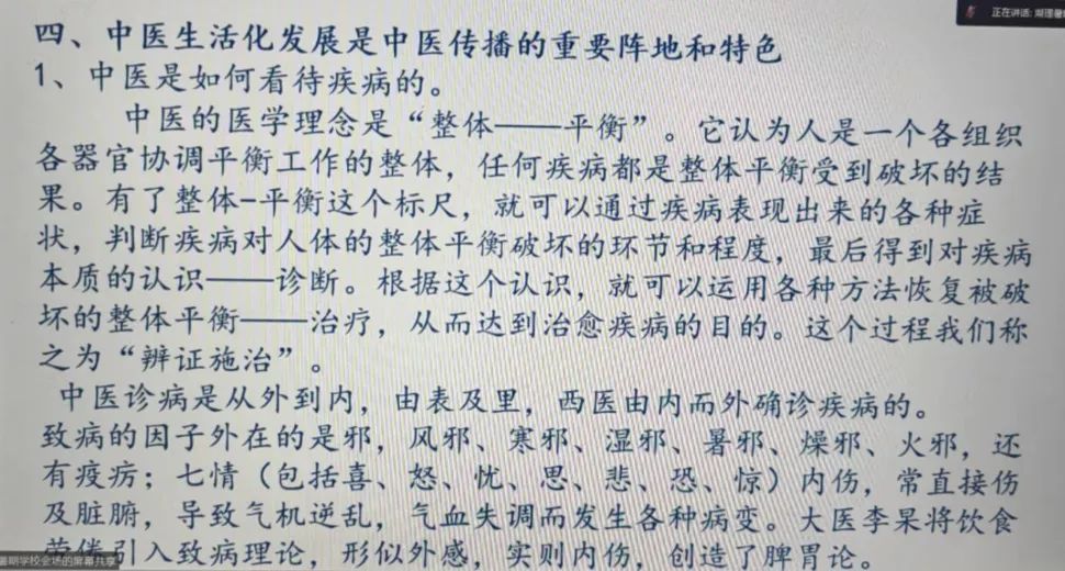 中醫(yī)的醫(yī)學(xué)理念是“整體——平衡”,它認(rèn)為人是一個各組織各器官協(xié)調(diào)平衡工作的整體,任何疾病都是整體平衡受到破壞的結(jié)果。有了整體-—平衡這個標(biāo)尺,通過診斷、治療,從而達(dá)到治愈疾病的目的,這個過程稱為“辨證施治”。中醫(yī)藥理論與現(xiàn)代科學(xué)學(xué)習(xí)是兩個體系,在基本理論方面互不兼容。中醫(yī)的智慧包括:天人合一、整體觀、辯證論治、治未病、和合等。繆嘉軍研究員表示學(xué)習(xí)中醫(yī)是人的文脈的一部分,目前中醫(yī)的問題是邊界模糊,邊界感不強(qiáng),但這也是優(yōu)勢,生活內(nèi)容豐富,從生活智慧中汲取中醫(yī)營養(yǎng),是現(xiàn)代普及中醫(yī)非常好渠道和特色。