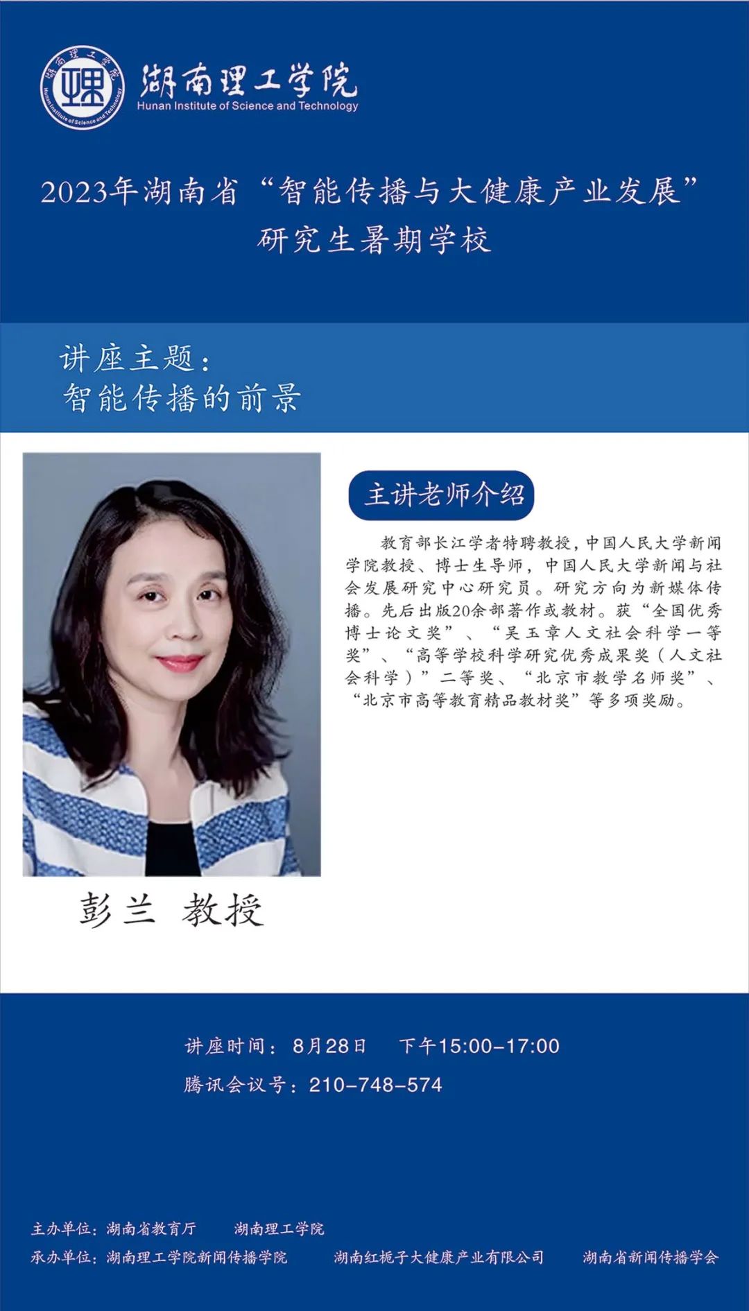 【編者按】8月16日至30日,由湖南省教育廳、湖南理工學(xué)院主辦,湖南理工學(xué)院新聞傳播學(xué)院、湖南紅梔子大健康產(chǎn)業(yè)有限公司、湖南省新聞傳播學(xué)會承辦的2023年湖南省“智能傳播與大健康產(chǎn)業(yè)發(fā)展”研究生暑期學(xué)校邀請國內(nèi)新聞傳播學(xué)科知名專家學(xué)者、健康傳播產(chǎn)業(yè)領(lǐng)域業(yè)界專家授課。來自湖南理工學(xué)院、中國傳媒大學(xué)等全國各大高校的119名博士研究生、碩士研究生、本科生入學(xué),開展專題研學(xué)。8月28日下午,教育部長江學(xué)者特聘教授,中國人民大學(xué)新聞學(xué)院教授、博士生導(dǎo)師,中國人民大學(xué)新聞與社會發(fā)展研究中心研究員彭蘭作了題為“從ChatGPT透視智能傳播的前景”的講座。本場講座主持人為湖南理工學(xué)院新聞傳播學(xué)院吳旖旎老師。本文根據(jù)講座內(nèi)容整理。