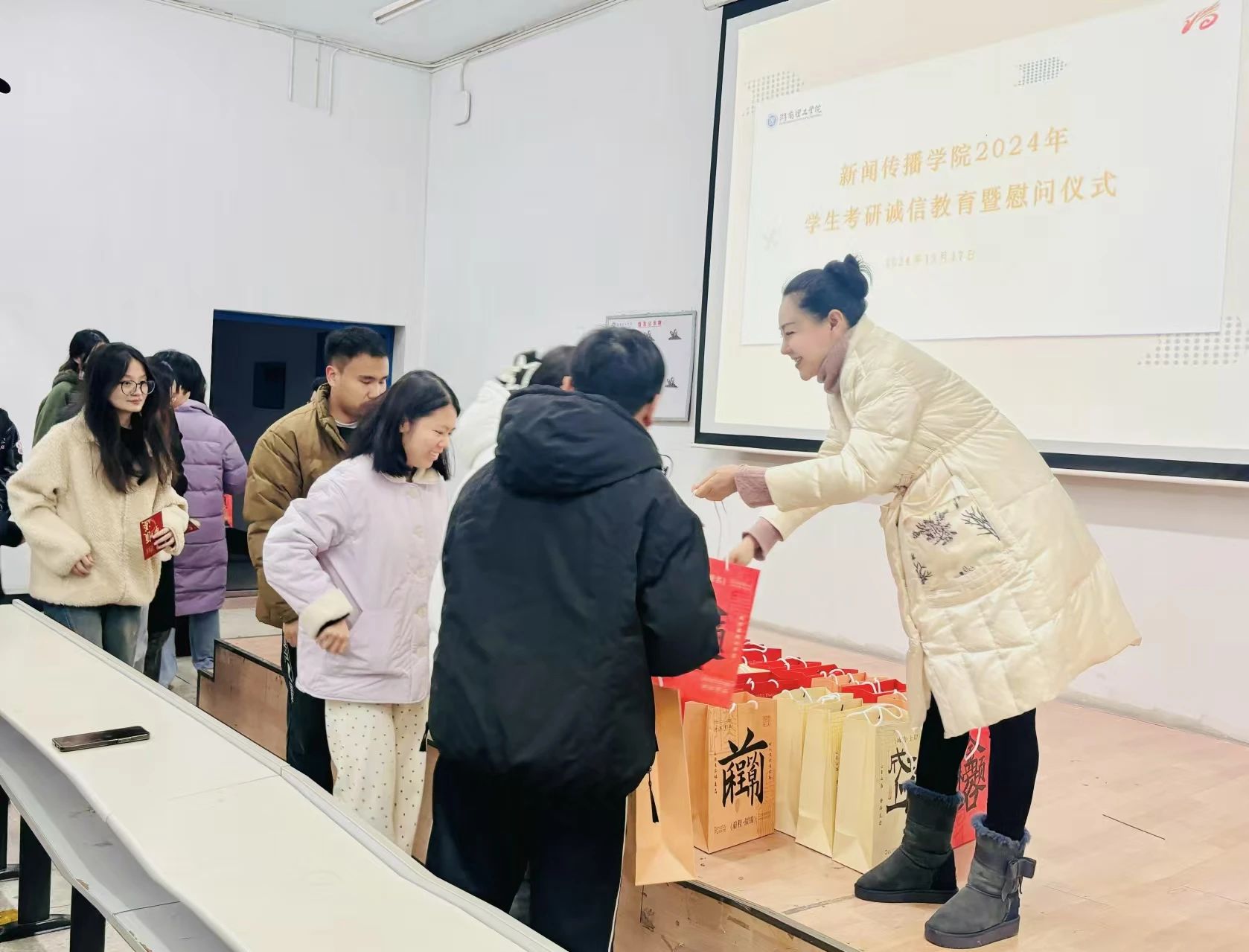 12月17日下午,新聞傳播學(xué)院在9T1教室舉行2024年考研學(xué)生誠信教育暨考前慰問會。院黨委書記石軍、黨委副書記潘昕出席,全體考研學(xué)生與會。會議由輔導(dǎo)員王勤主持。