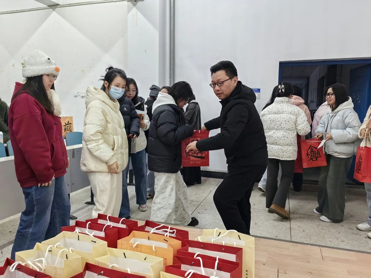 活動后,石軍、潘昕向考生發(fā)放考研慰問禮包,預(yù)祝他們?nèi)〉煤贸煽儯慌e奪魁。