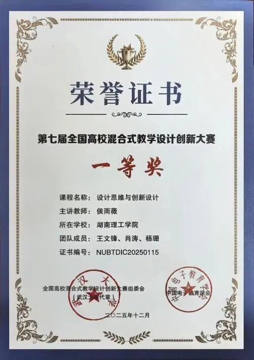近日,第七屆全國(guó)高校混合式教學(xué)設(shè)計(jì)創(chuàng)新大賽獲獎(jiǎng)名單正式公布。文新院侯雨薇老師主講的《設(shè)計(jì)思維與創(chuàng)新設(shè)計(jì)》課程在全國(guó)眾多優(yōu)秀參賽課程中脫穎而出,榮獲全國(guó)一等獎(jiǎng)。
