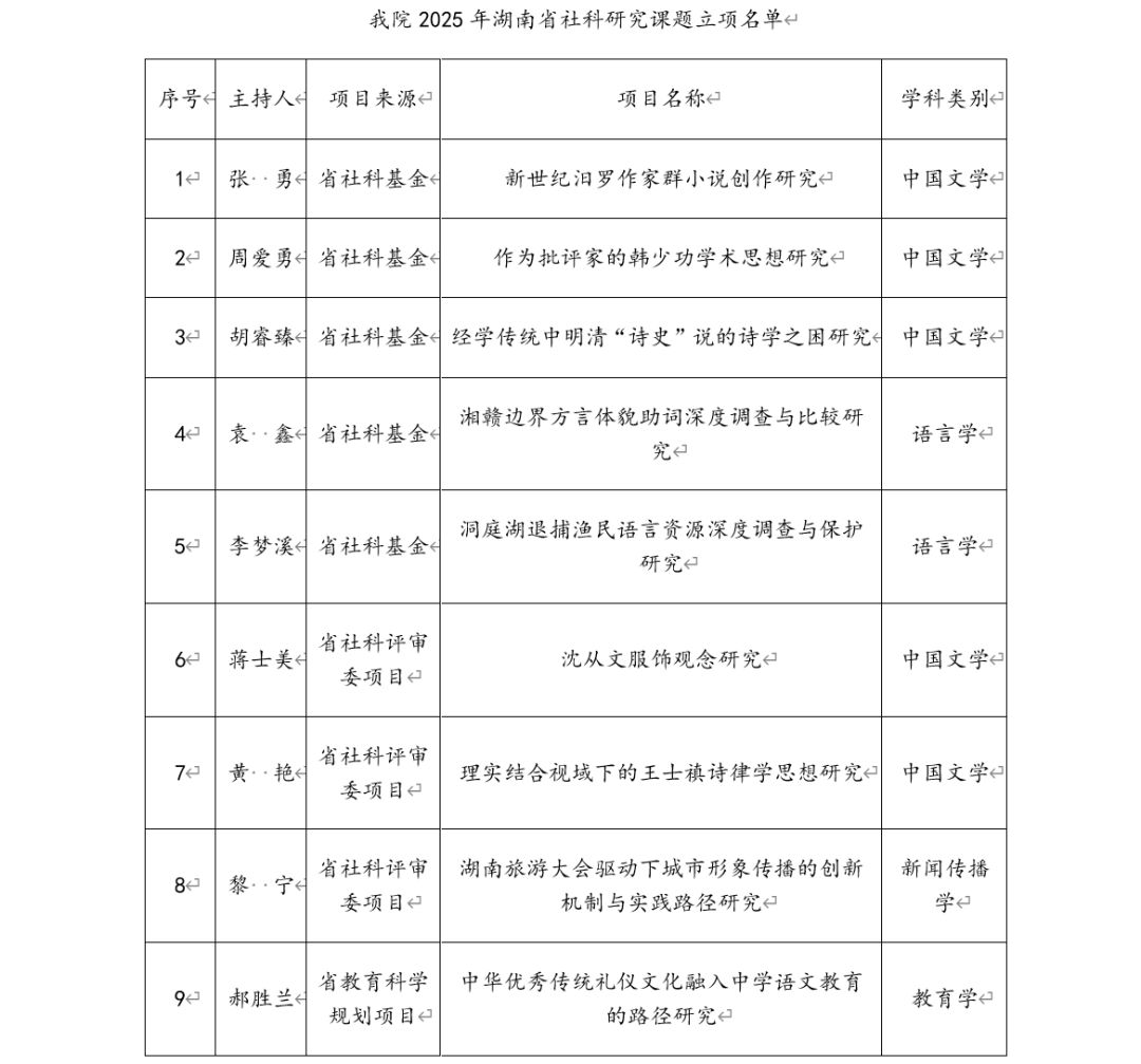 近日,湖南省社科工作辦、湖南省社科評審辦相繼公布省社科基金項目與省社科成果評審委項目立項評審結(jié)果,文新學院教師憑借深厚的學科積淀與扎實的科研實力,在省級社科項目立項上再獲佳績。本次項目總立項數(shù)較往年穩(wěn)中有增,彰顯了學院在哲學社科研究領(lǐng)域的強勁勢頭與發(fā)展?jié)摿Α?/span>
