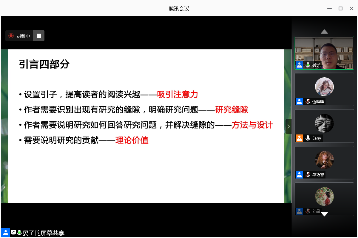 最后,晏青教授強(qiáng)調(diào)了論文寫作中引言部分的重要性,并展示了引言寫作的基本結(jié)構(gòu)。講座結(jié)束后,學(xué)員們紛紛通過線上鼓掌、點(diǎn)贊、留言等方式表達(dá)對(duì)教授的喜愛和感謝。(編輯/伍晴暉 責(zé)編/王琳楠 張政 主審/王文鋒)