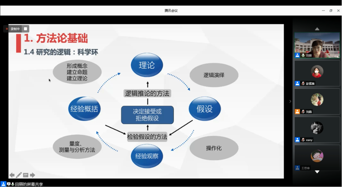 在方法論基礎(chǔ)方面,田麗教授系統(tǒng)地介紹了方法論的概念、方法論的演進(jìn)、以及如何提出科學(xué)的問題、如何進(jìn)行具體的研究設(shè)計等主要內(nèi)容。其中,田教授還借助“科學(xué)環(huán)”對社會研究的邏輯過程進(jìn)行了詳細(xì)介紹。她指出,做研究首先應(yīng)該具有問題意識,在研究問題提出時應(yīng)注意區(qū)分科學(xué)問題與價值問題;其次,要思考其是否能回應(yīng)社會關(guān)切或者符合理論發(fā)展需要,是否具有創(chuàng)新性和可行性;最后,要注意根據(jù)研究問題選擇研究方法,再根據(jù)研究方法來選擇研究工具。只有厘清自己的研究問題、研究方法及具體研究工具,才能更好地服務(wù)于研究設(shè)計的落地。