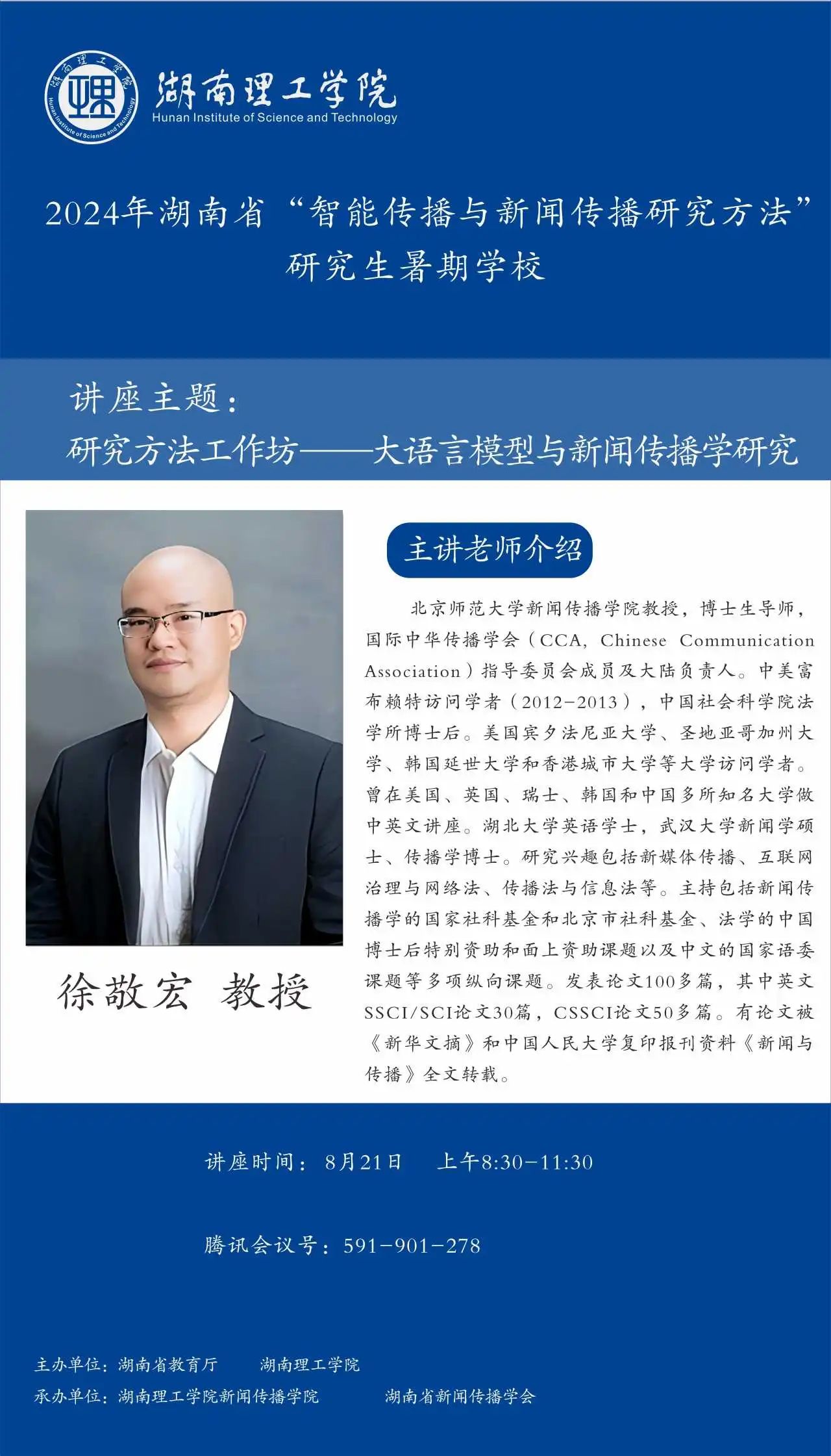 【編者按】8月16日至30日,由湖南省教育廳、湖南理工學院主辦,湖南理工學院新聞傳播學院、湖南省新聞傳播學會承辦的2024年湖南省“智能傳播與新聞傳播研究方法”研究生暑期學校邀請國內(nèi)新聞傳播學科知名專家學者授課。來自中國社會科學院大學、中國傳媒大學、湖南理工學院等全國各大高校的159名博士研究生、碩士研究生、本科生入學,開展專題研學。8月21日,北京師范大學新聞傳播學院教授、博士生導(dǎo)師、國際中華傳播學會指導(dǎo)委員會成員及大陸負責人徐敬宏作了題為“大語言模型與新聞傳播學研究”的講座。本場講座主持人為湖南理工學院新聞傳播學院碩士生導(dǎo)師劉晶博士。本文根據(jù)講座內(nèi)容整理。