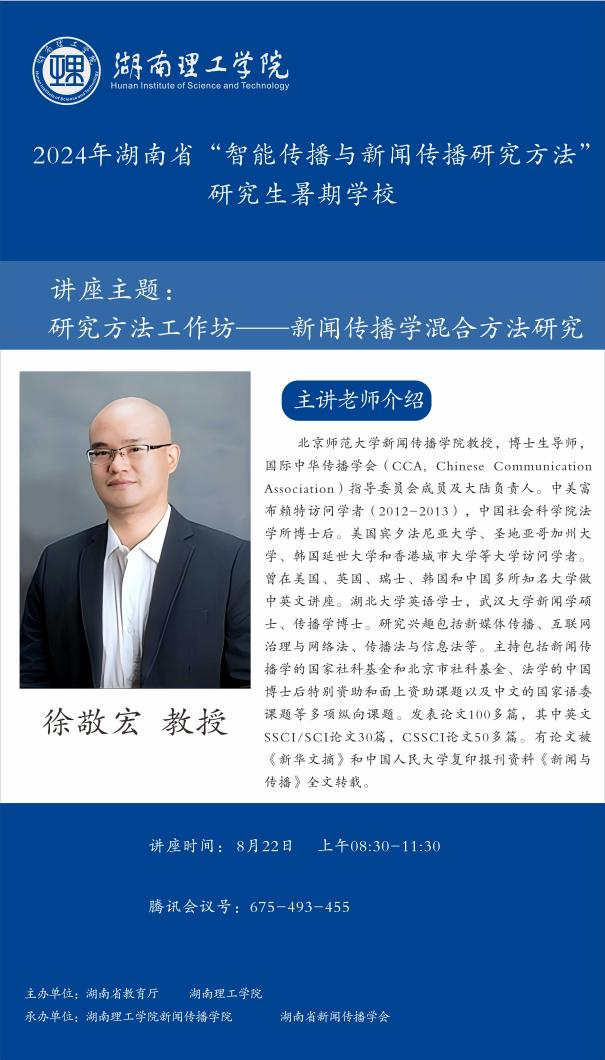 【編者按】8月16日至30日,由湖南省教育廳、湖南理工學(xué)院主辦,湖南理工學(xué)院新聞傳播學(xué)院、湖南省新聞傳播學(xué)會(huì)承辦的2024年湖南省“智能傳播與新聞傳播研究方法”研究生暑期學(xué)校邀請(qǐng)國(guó)內(nèi)新聞傳播學(xué)科知名專家學(xué)者授課。來自中國(guó)社會(huì)科學(xué)院大學(xué)、中國(guó)傳媒大學(xué)、湖南理工學(xué)院等全國(guó)各大高校的159名博士研究生、碩士研究生、本科生入學(xué),開展專題研學(xué)。8月22日,北京師范大學(xué)新聞傳播學(xué)院教授、博士生導(dǎo)師、國(guó)際中華傳播學(xué)會(huì)指導(dǎo)委員會(huì)成員及大陸負(fù)責(zé)人徐敬宏作了題為“新聞傳播學(xué)混合方法研究”的講座。本場(chǎng)講座主持人為湖南理工學(xué)院新聞傳播學(xué)院碩士生導(dǎo)師劉晶博士。本文根據(jù)講座內(nèi)容整理。