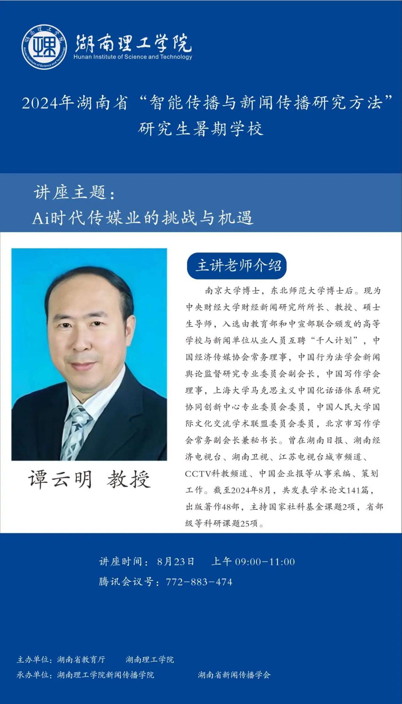 【編者按】8月16日至30日,由湖南省教育廳、湖南理工學院主辦,湖南理工學院新聞傳播學院、湖南省新聞傳播學會承辦的2024年湖南省“智能傳播與新聞傳播研究方法”研究生暑期學校邀請國內新聞傳播學科知名專家學者授課。來自中國社會科學院大學、中國傳媒大學、湖南理工學院等全國各大高校的159名博士研究生、碩士研究生、本科生入學,開展專題研學。8月23日上午,中央財經(jīng)大學財經(jīng)新聞研究所所長、碩士生導師譚云明教授作了題為“AI 時代傳媒業(yè)的挑戰(zhàn)與機遇”的講座。本場講座主持人為湖南理工學院新聞傳播學院碩士生導師吳旖旎博士。本文根據(jù)講座內容整理。