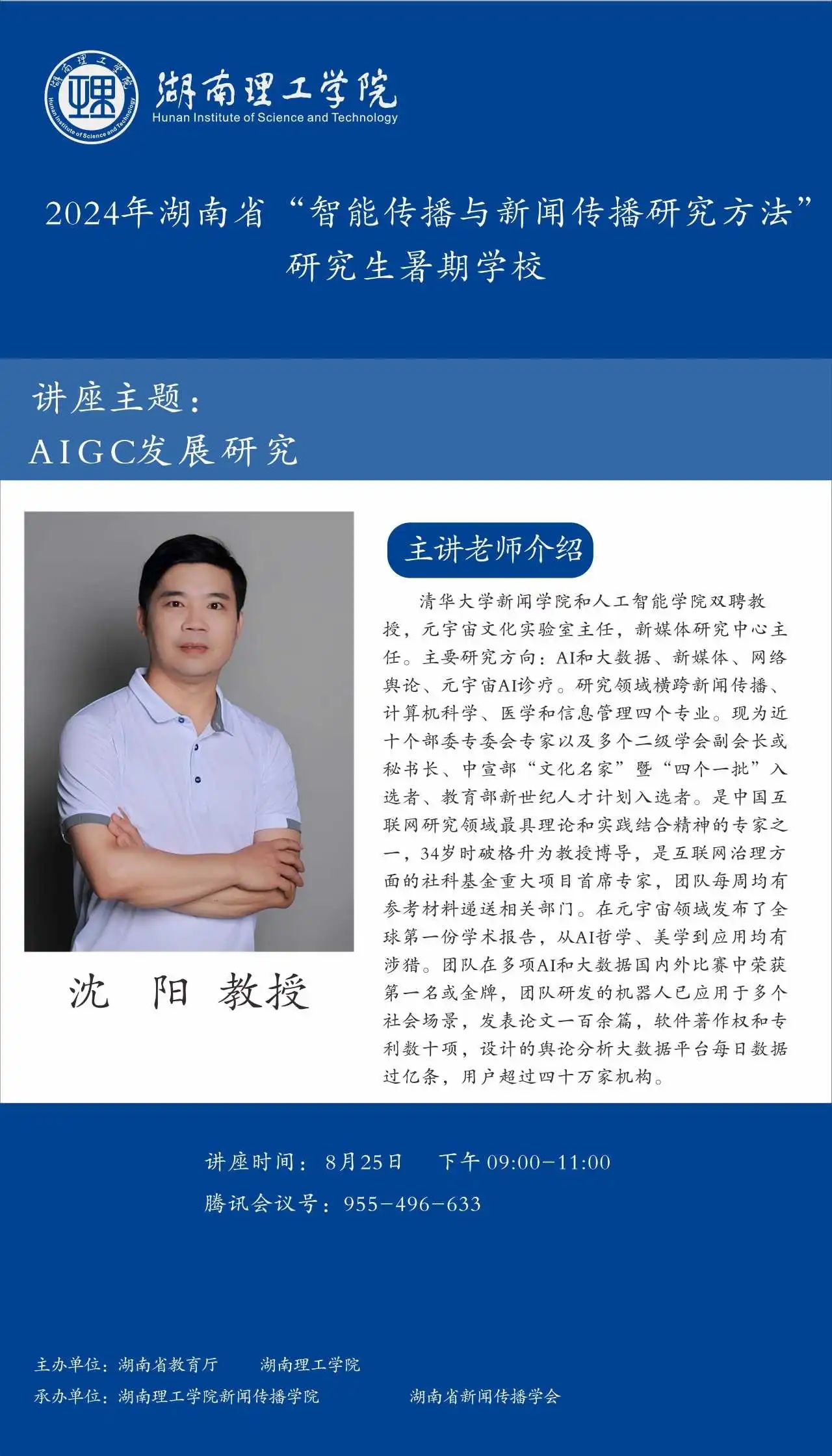 【編者按】8月16日至30日,由湖南省教育廳、湖南理工學(xué)院主辦,湖南理工學(xué)院新聞傳播學(xué)院、湖南省新聞傳播學(xué)會承辦的2024年湖南省“智能傳播與新聞傳播研究方法”研究生暑期學(xué)校邀請國內(nèi)新聞傳播學(xué)科知名專家學(xué)者授課。來自中國社會科學(xué)院大學(xué)、中國傳媒大學(xué)、湖南理工學(xué)院等全國各大高校的159名博士研究生、碩士研究生、本科生入學(xué),開展專題研學(xué)。8月25日,清華大學(xué)新聞學(xué)院和人工智能學(xué)院雙聘教授、元宇宙文化實驗室主任、新媒體研究中心主任沈陽作了題為“AIGC發(fā)展研究”的講座。本場講座主持人為湖南理工學(xué)院新聞傳播學(xué)院邱蕾博士。本文根據(jù)講座內(nèi)容整理。