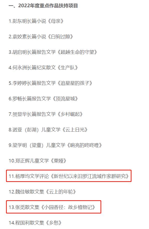 近日,湖南省作家協(xié)會(huì)公布2022年省作協(xié)重點(diǎn)作品扶持項(xiàng)目立項(xiàng)情況。我校中國語言文學(xué)學(xué)院楊厚均教授的文學(xué)評論《新世紀(jì)以來汨羅江流域作家群研究》、張覓博士的散文集《小園香徑:故鄉(xiāng)植物記》入選。據(jù)悉,此次全省共有14部作品入選。湖南省作家協(xié)會(huì)年度重點(diǎn)扶持項(xiàng)目是省作協(xié)推動(dòng)主題創(chuàng)作、扶持實(shí)力作家、打造文藝精品陣地的重要舉措,關(guān)注省內(nèi)作家在各類文體的創(chuàng)作,并通過資金支持、項(xiàng)目指導(dǎo)、宣傳推介等方式,選拔具有典型性和創(chuàng)新性的作家原創(chuàng)文學(xué)作品,并對其進(jìn)行重點(diǎn)培育和扶持。