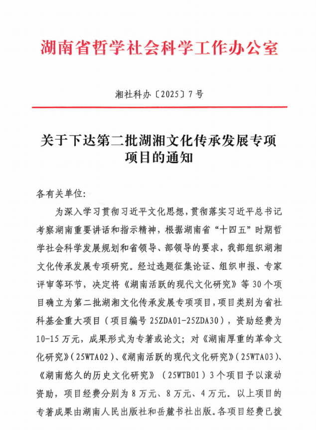 近日,湖南省哲學(xué)社會(huì)科學(xué)工作辦公室下達(dá)了第二批湖湘文化傳承發(fā)展專項(xiàng)項(xiàng)目,我院李有梁教授牽頭申報(bào)的“湖湘屈學(xué)文獻(xiàn)整理與研究”項(xiàng)目通過專家評(píng)審,獲批省社科2025年度基金重大項(xiàng)目,項(xiàng)目編號(hào)25ZDA10。