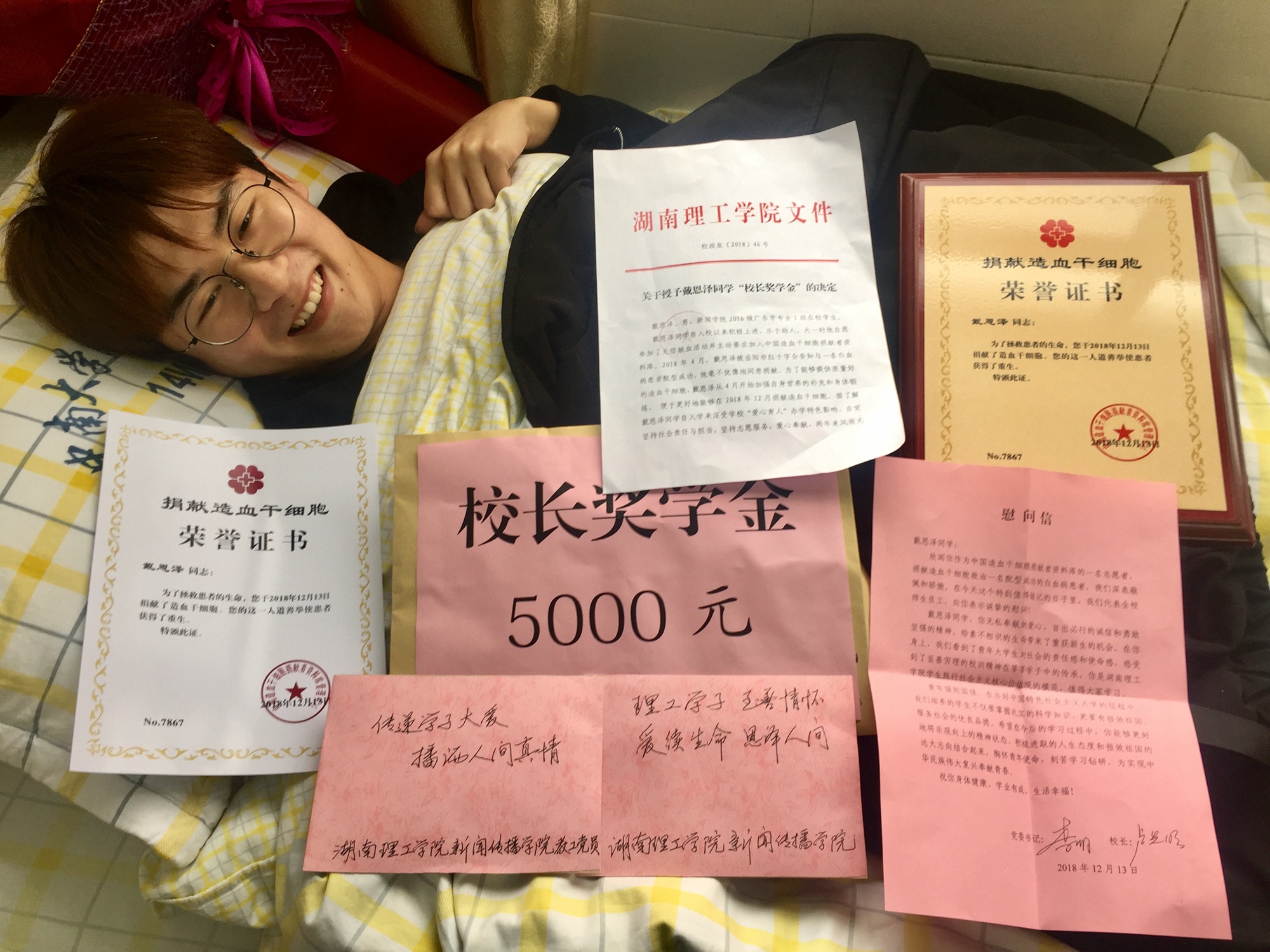 在湘雅附三醫(yī)院血液科造血干細胞采集室里,戴恩澤一邊接受干細胞采集,一邊接受學(xué)校短暫的慰問。徐小立向戴恩澤頒發(fā)了“校長獎學(xué)金”,新聞學(xué)院送上了學(xué)院和全體黨員的慰問金。面對這一榮譽,戴恩澤平靜地表示,能夠在關(guān)鍵時候為社會做出貢獻,不足掛齒。他現(xiàn)場將5000元“校長獎學(xué)金”和學(xué)院4500元慰問金轉(zhuǎn)交紅十字會負責(zé)人,要求捐給需要救助的貧困兒童。