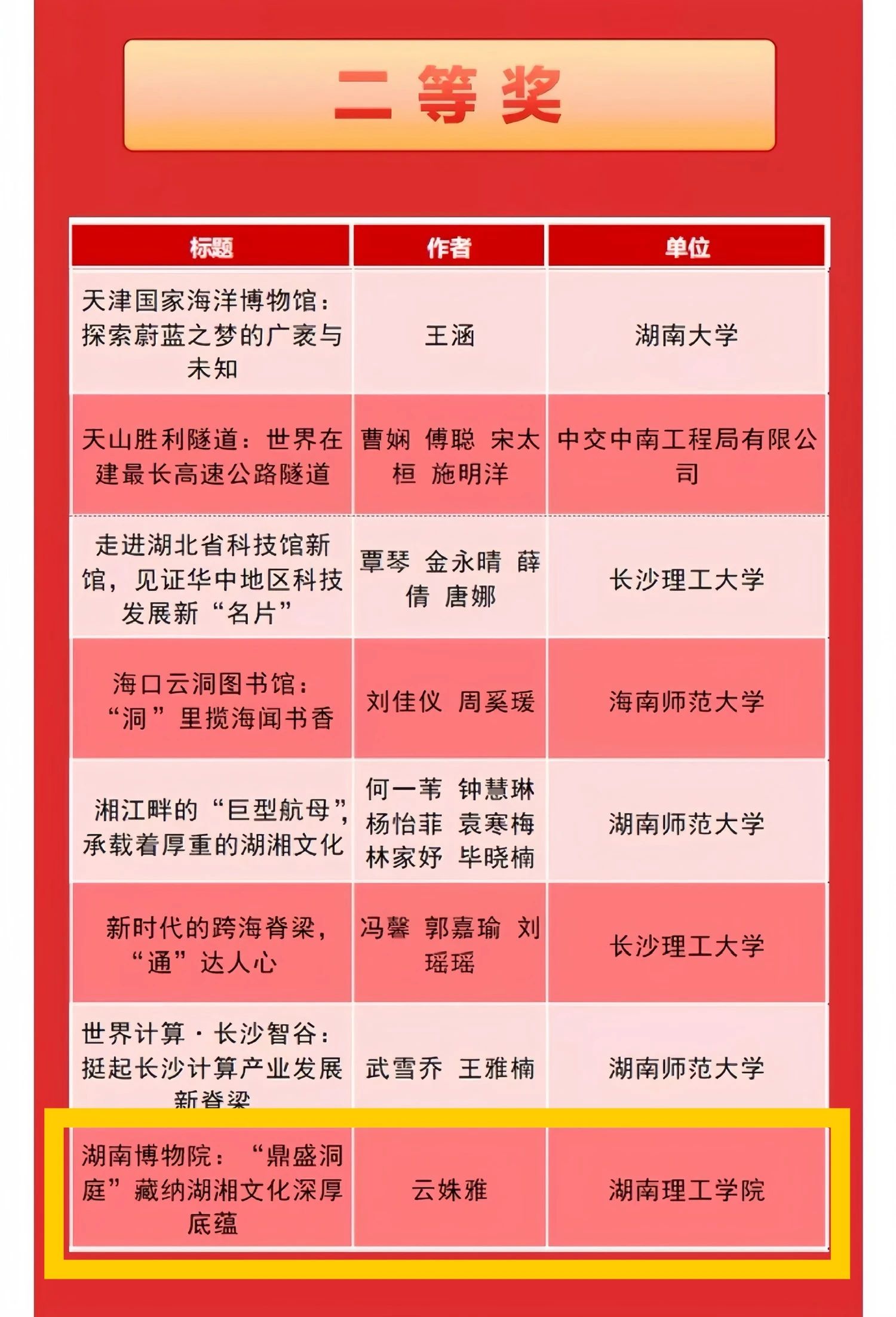 云姝雅同學(xué)的《湖南博物院:“鼎盛洞庭”藏納湖文化深厚底蘊(yùn)》獲二等獎(jiǎng);劉心語(yǔ)同學(xué)的《湖南美術(shù)館:湖南文化強(qiáng)省建設(shè)“新名片”》獲三等獎(jiǎng)及最佳人氣獎(jiǎng);戴娟同學(xué)的《百年上海電影的魅力,這座博物館全部呈現(xiàn)給你》獲優(yōu)秀獎(jiǎng)。