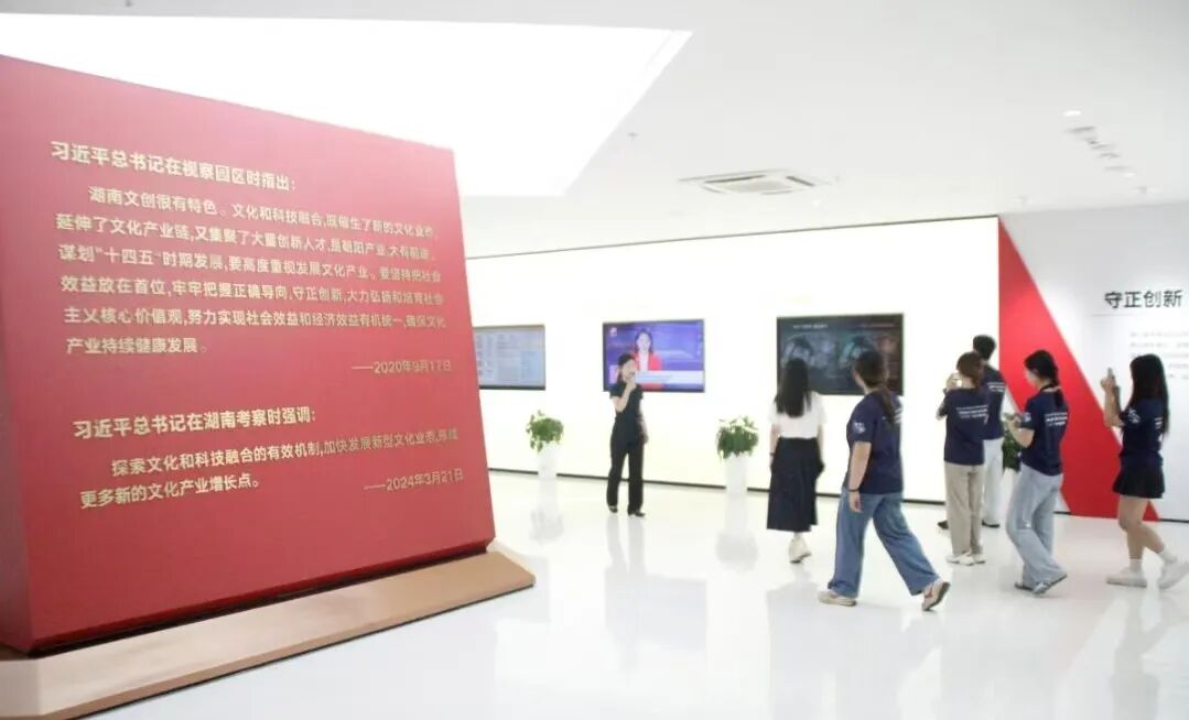 團(tuán)隊(duì)成員跟隨講解員重溫了習(xí)近平總書記考察馬欄山時(shí)的重要講話精神。習(xí)近平總書記親臨園區(qū)考察時(shí)曾肯定“湖南文創(chuàng)很有特色”,指出“文化和科技融合既催生了新的文化業(yè)態(tài)、延伸了文化產(chǎn)業(yè)鏈,又集聚了大量創(chuàng)新人才,是朝陽(yáng)產(chǎn)業(yè),大有前途”,為馬欄山指明了“文化和科技融合”的發(fā)展方向。殷殷囑托化為守正創(chuàng)新、雙效統(tǒng)一的澎湃動(dòng)力,激蕩出科技賦能、融合共生的萬(wàn)千氣象。