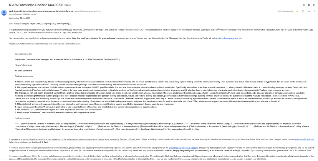 近日,國際傳播學界最具影響力的學術組織——國際傳播學協(xié)會(International Communication Association, ICA) 向全球投稿者發(fā)送了第76屆年會的錄用通知。文學與新聞傳播學院王文鋒教授指導碩士研究生曾憲荃撰寫的學術論文《網(wǎng)紅傳播策略與受眾政治極化:基于2024年美國大選的研究》(Influencers' Communication Strategies and Audiences' Political Polarization in US 2024 Presidential Election),在全球數(shù)千篇競爭激烈的投稿中脫穎而出,經(jīng)嚴格的同行評審,以湖南理工學院文學與新聞傳播學院為第一作者單位,被會議正式接收。