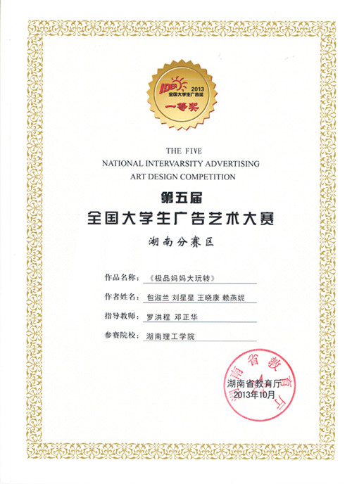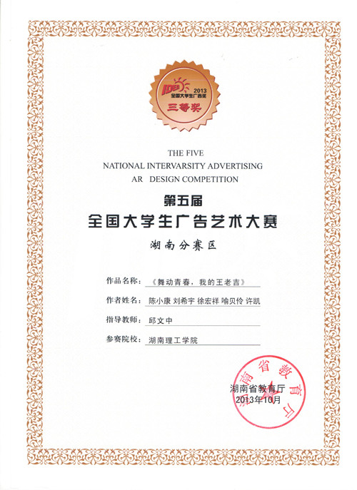 2013年第五屆全國大學生廣告藝術大賽獲獎作品證書