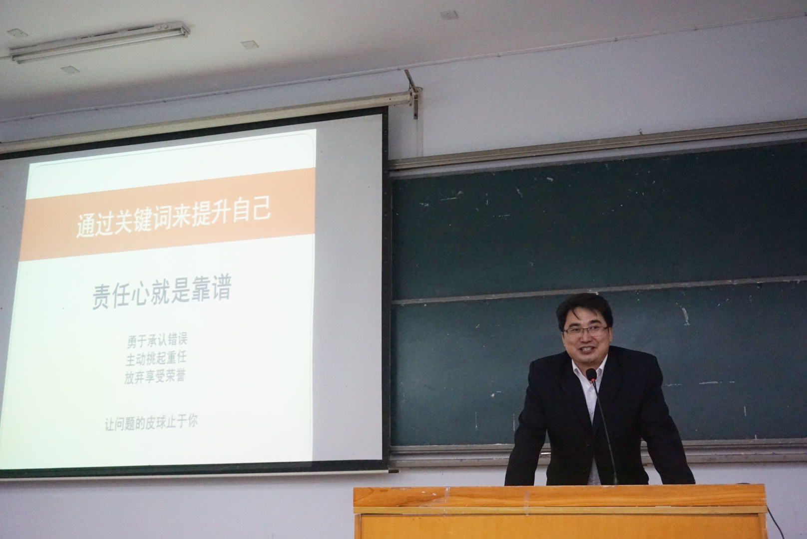 楊壽志圍繞“通過關(guān)鍵字來提升自己”這一主題,從自身經(jīng)歷出發(fā),從五個方面展開講述。一是選擇大于努力。在正確的時間做正確的事,往往可以達(dá)到事半功倍的效果。二是忠誠度大于能力。忠誠于身邊的每一個人,每一件事,會讓人有意想不到的收獲。三是關(guān)系才是敲門磚。雖然關(guān)系有強(qiáng)弱之分,但無論是強(qiáng)關(guān)系還是弱關(guān)系,恰當(dāng)使用就對成功有益。四是責(zé)任心就是靠譜。勇于承認(rèn)錯誤和敢于挑起重?fù)?dān)的人更易被人賞識。五是自動自發(fā)。做事要主動,唯有那些自覺將“要我做”轉(zhuǎn)換成“我要做”的人,才會快人一步取得成功。他將“整、借、學(xué)、變”4個字送給在場同學(xué)。他說:要是一個人既會整合資源,借力借勢,又懂得如何保持積極的學(xué)習(xí)心態(tài)和適時改變自己陳舊的觀念,那么他離成功就不遠(yuǎn)了。