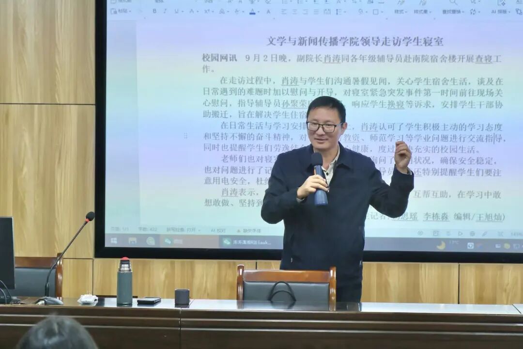 肖濤以往期稿件為案例,圍繞如何撰寫高質(zhì)量新聞稿展開指導。他強調(diào),新聞采寫需嚴格遵循“五要素”規(guī)范,既要精準用詞、聚焦核心信息,也要注重正能量傳遞與主題凝練;要通過現(xiàn)場觀察、主動提問等方式豐富細節(jié),增強稿件的真實感與現(xiàn)場感。肖濤表示,通訊社是連接新聞理論與實踐的專業(yè)成長平臺,鼓勵同學們及時復盤不足、珍惜實踐機會,在實操中提升專業(yè)能力。他同時提醒大家強化團隊協(xié)作意識,以學習成長為核心參與社團活動。