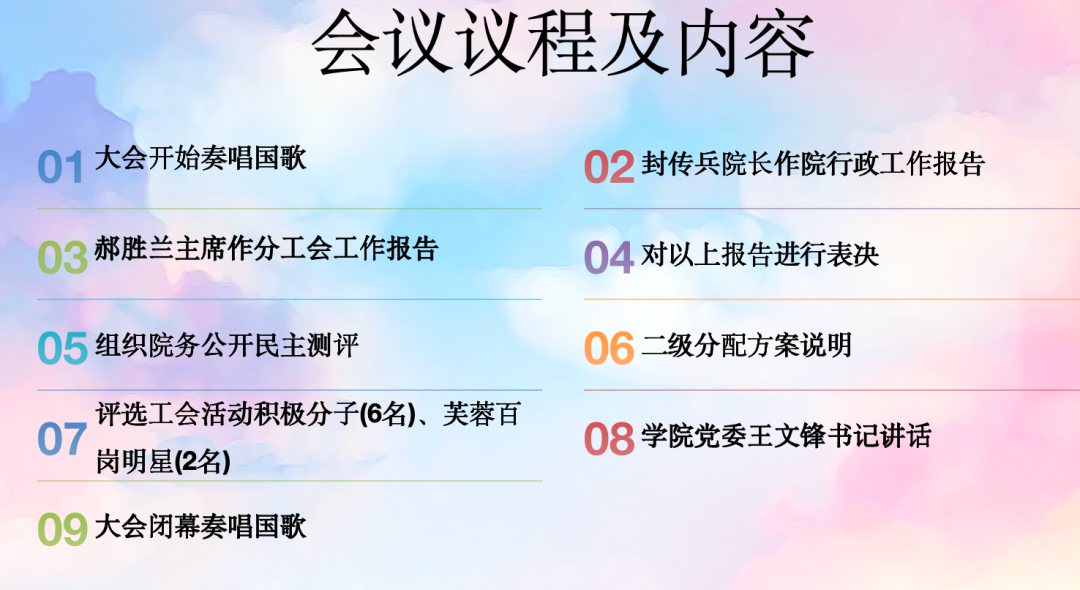 會議審議并通過了學(xué)院行政工作報告、分工會工作報告及其他重要事項,評選工會活動積極分子6名、芙蓉百崗明星2名。